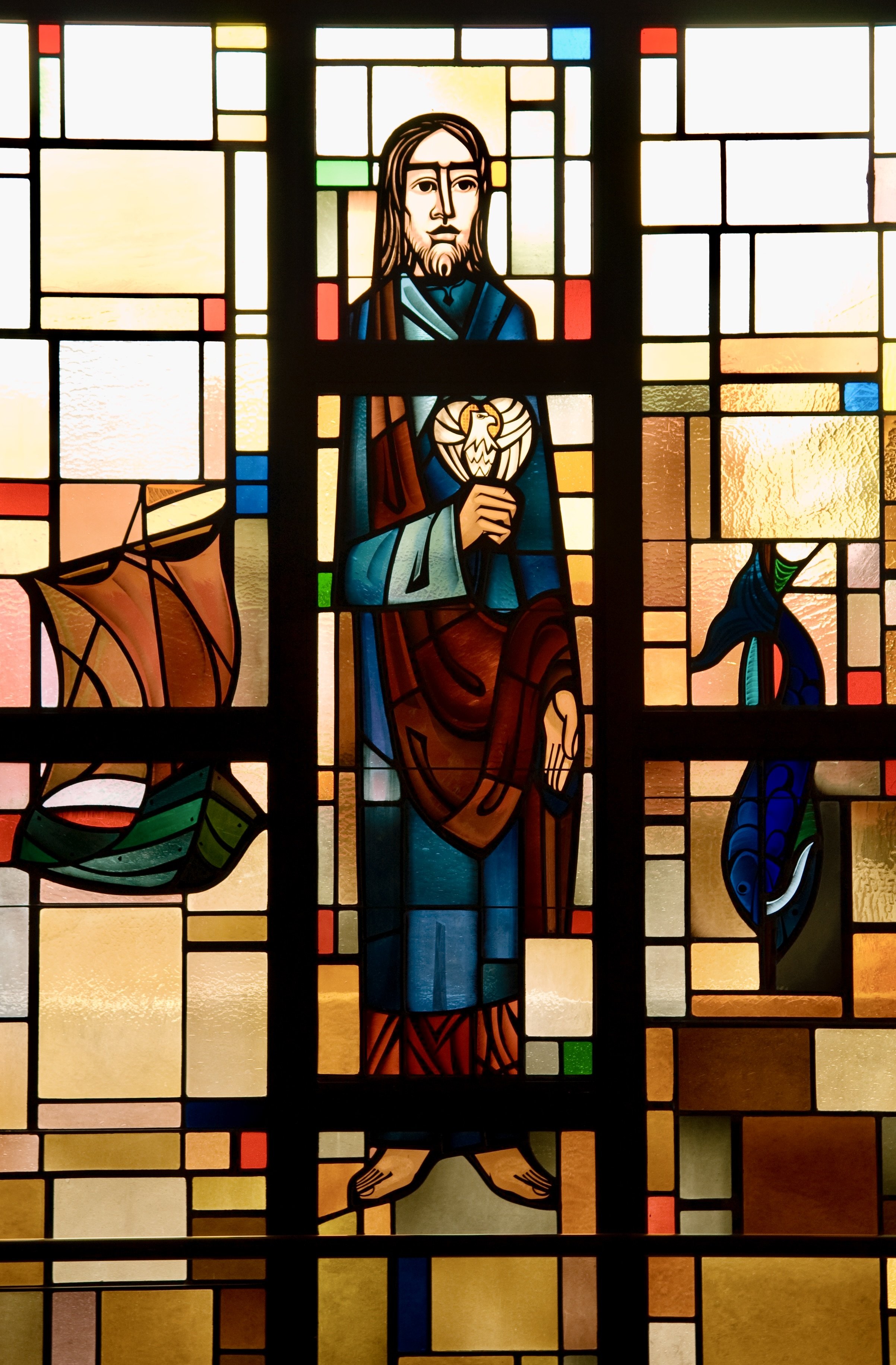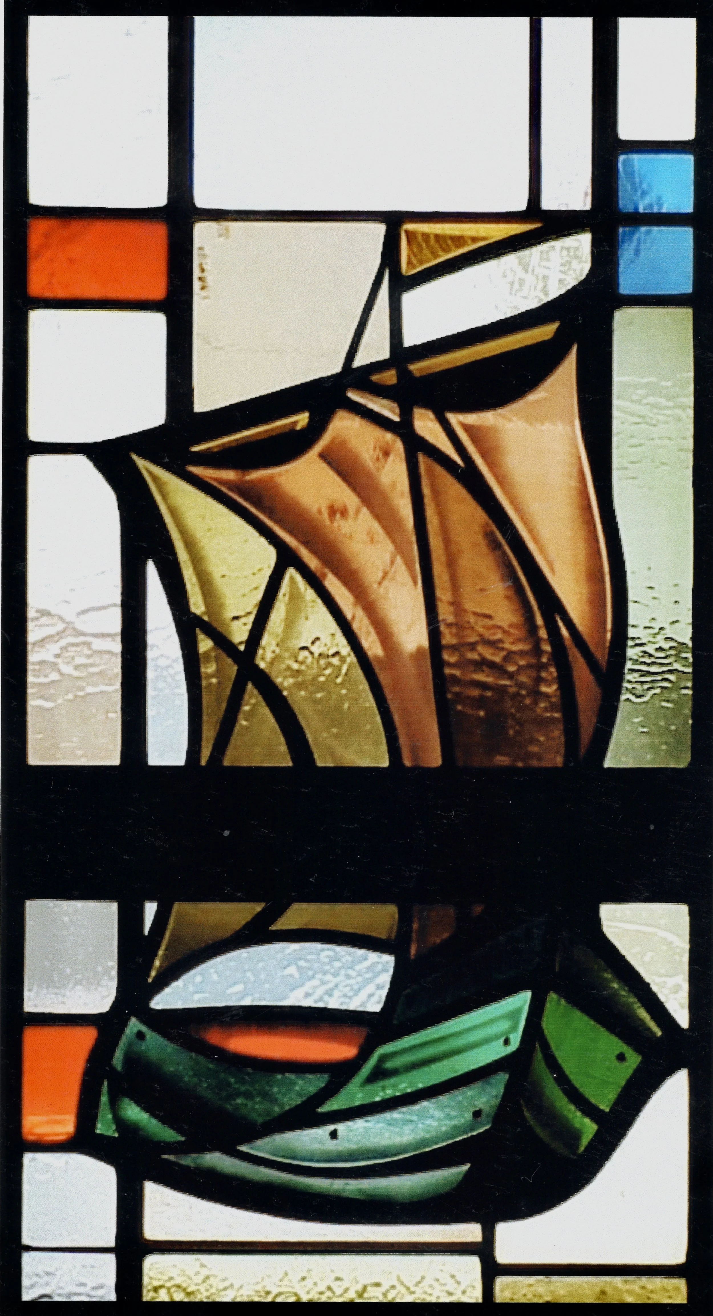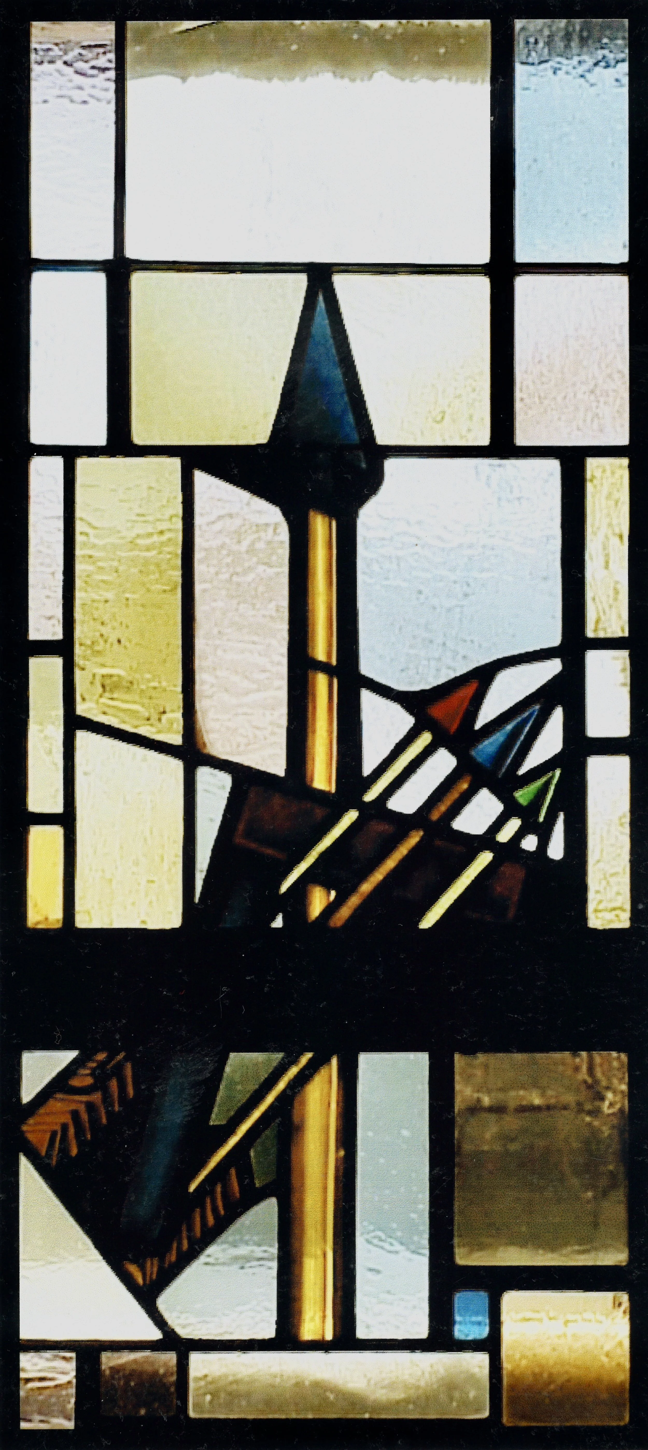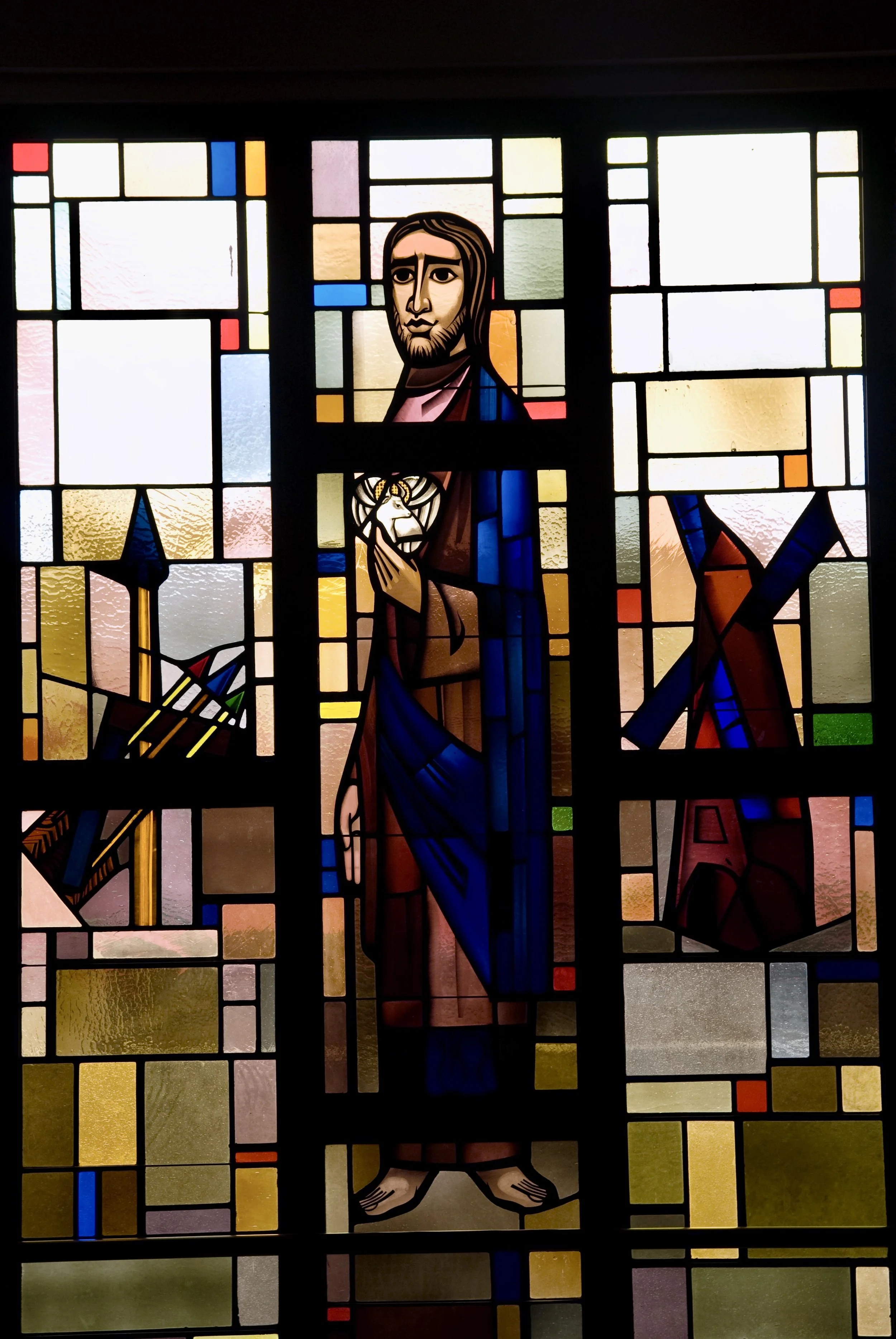 Ship, representing St. Jude. Jude is the author of the last Epistle in the New Testament and he was martyred in Persia by a lance or halberd. The Ship is symbolic of the Church of Christ which floats safely as the ark of Noah did. St. Ambrose compares the Church to a ship and the Cross to a ship's mast. The ship also recalls the Christ's miracle on the Sea of Galilee when he calmed the waters and saved the apostles from capsizing.