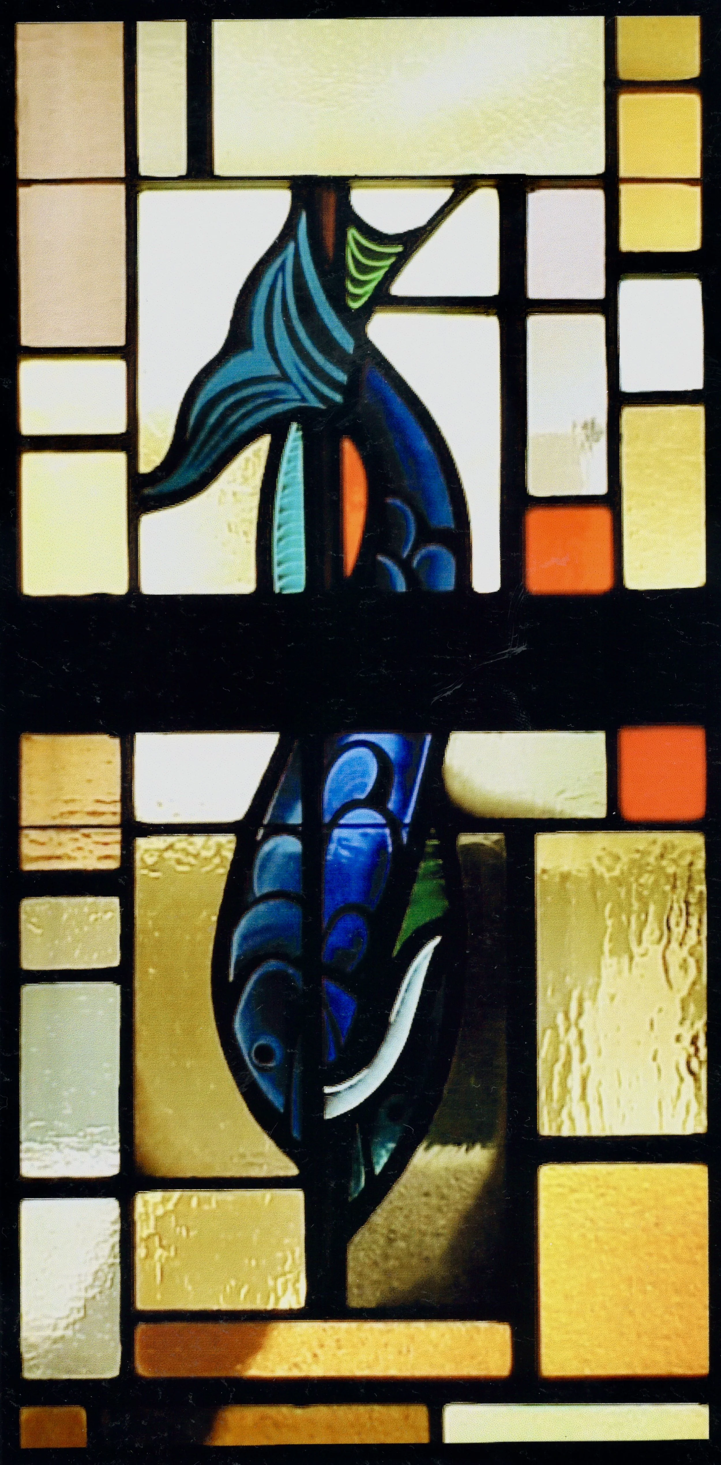 Fish on a Boat Hook represents the Apostle St. Simon. In Greek, the first letters of the words "Jesus Christ God's Son Savior" form the word "fish."Thus, the fish is a symbol of Jesus Christ. The fish also symbolizes baptism for as the fish cannot live except in water, nor can the Christian without the waters of baptism. Simon was one of the shepherds to whom the angels revealed the birth of Christ. He was martyred in Persia with St. Jude.