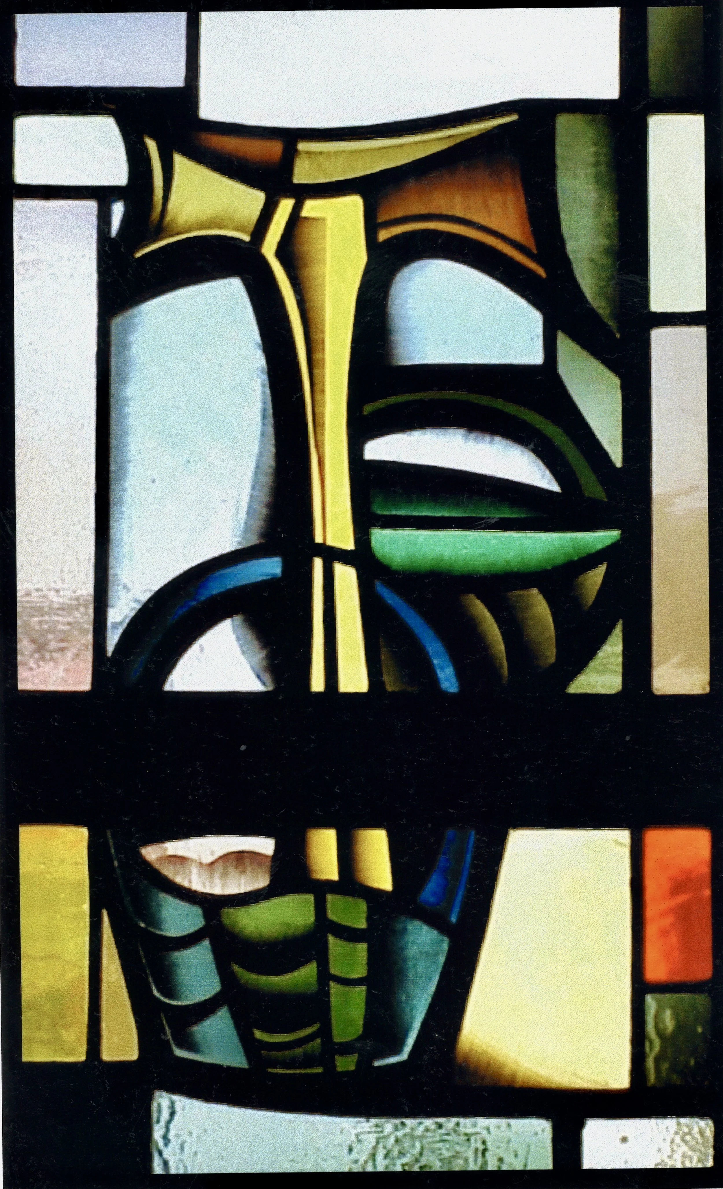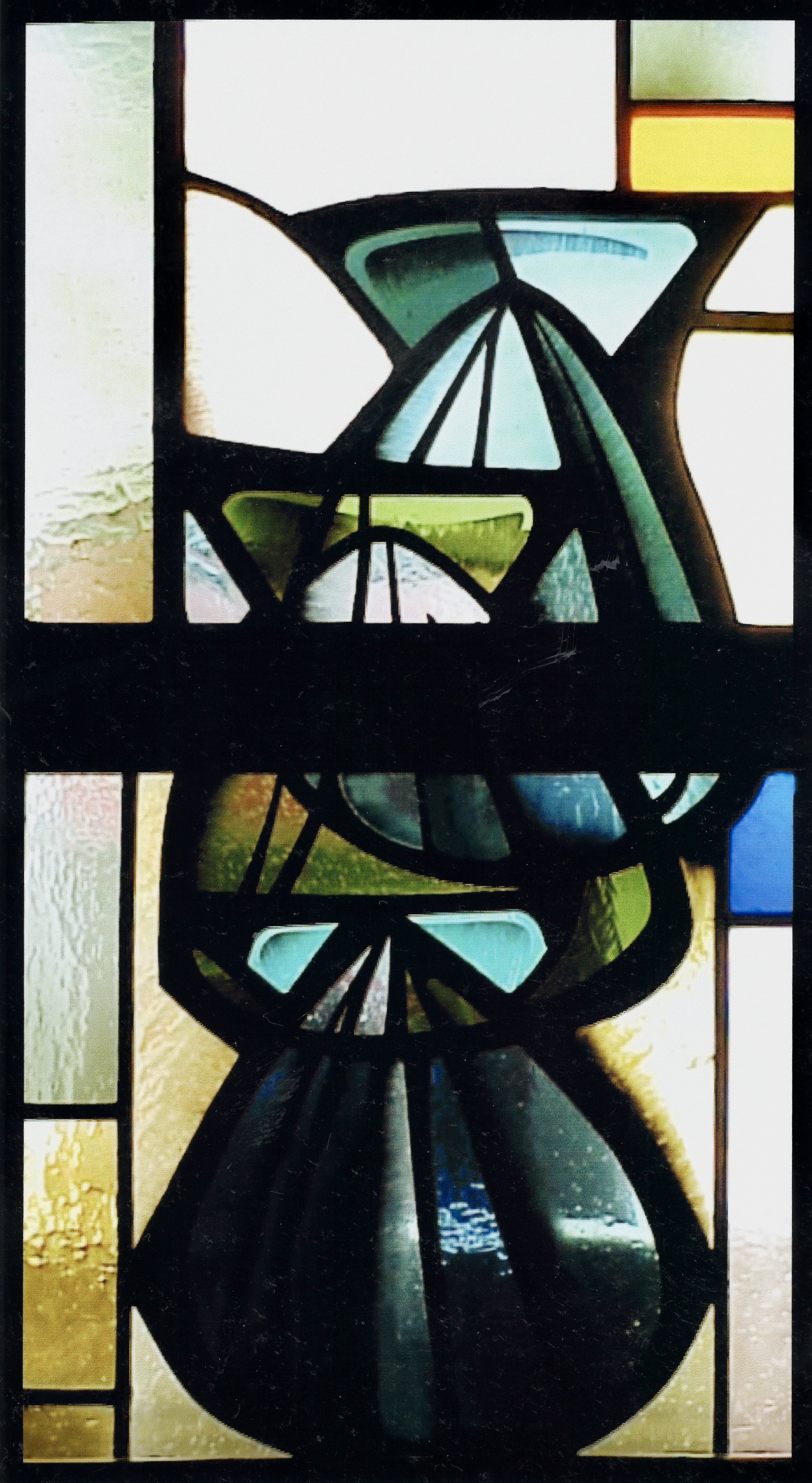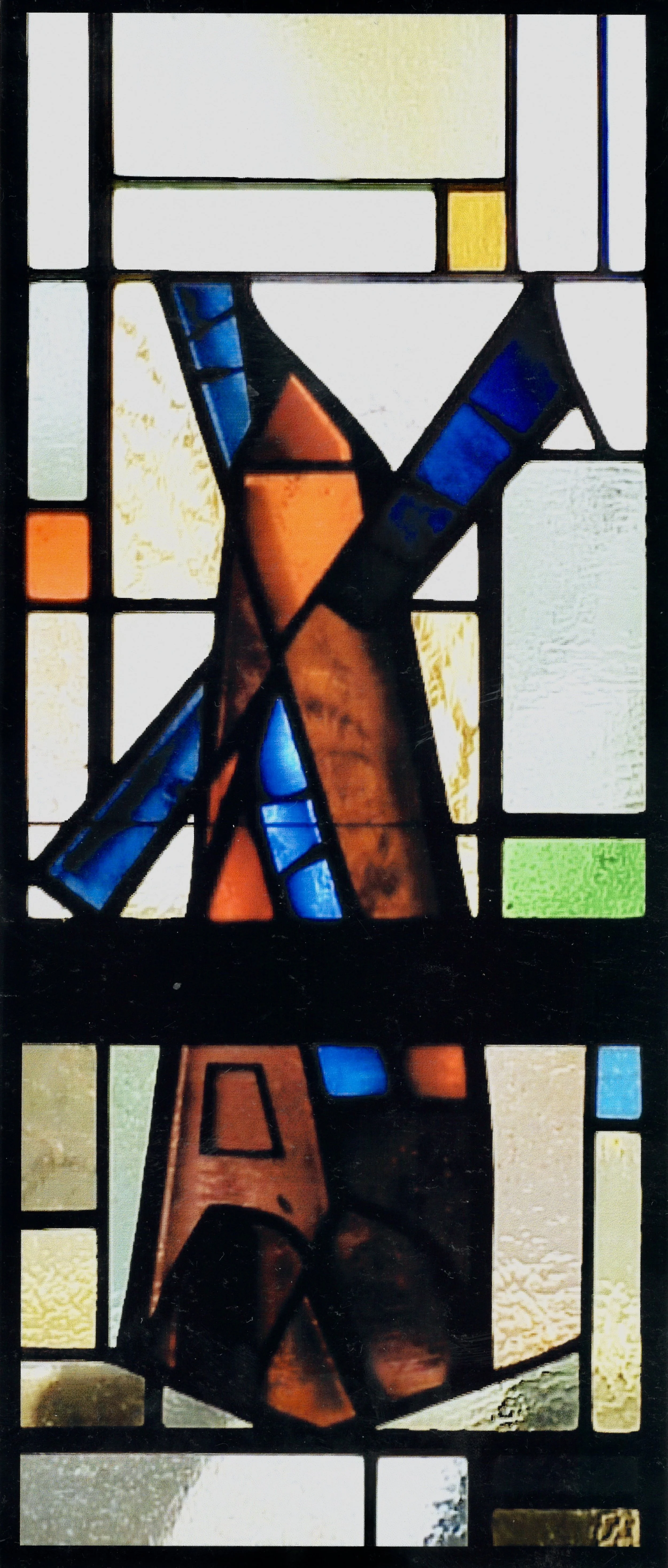 Tau Cross and Basket depicts the Apostle St. Philip. The cross is also known as the Egyptian or Tau cross which has three arms, not four, in the shape of the letter T. Tradition states that Moses lifted the serpent in the wilderness on such a cross, thus the cross is known as the Old Testament cross. This story foreshadows Christ upon the cross as discussed in John 3:14. The Tau cross is associated with St. Philip as he was crucified upon a cross of this type.