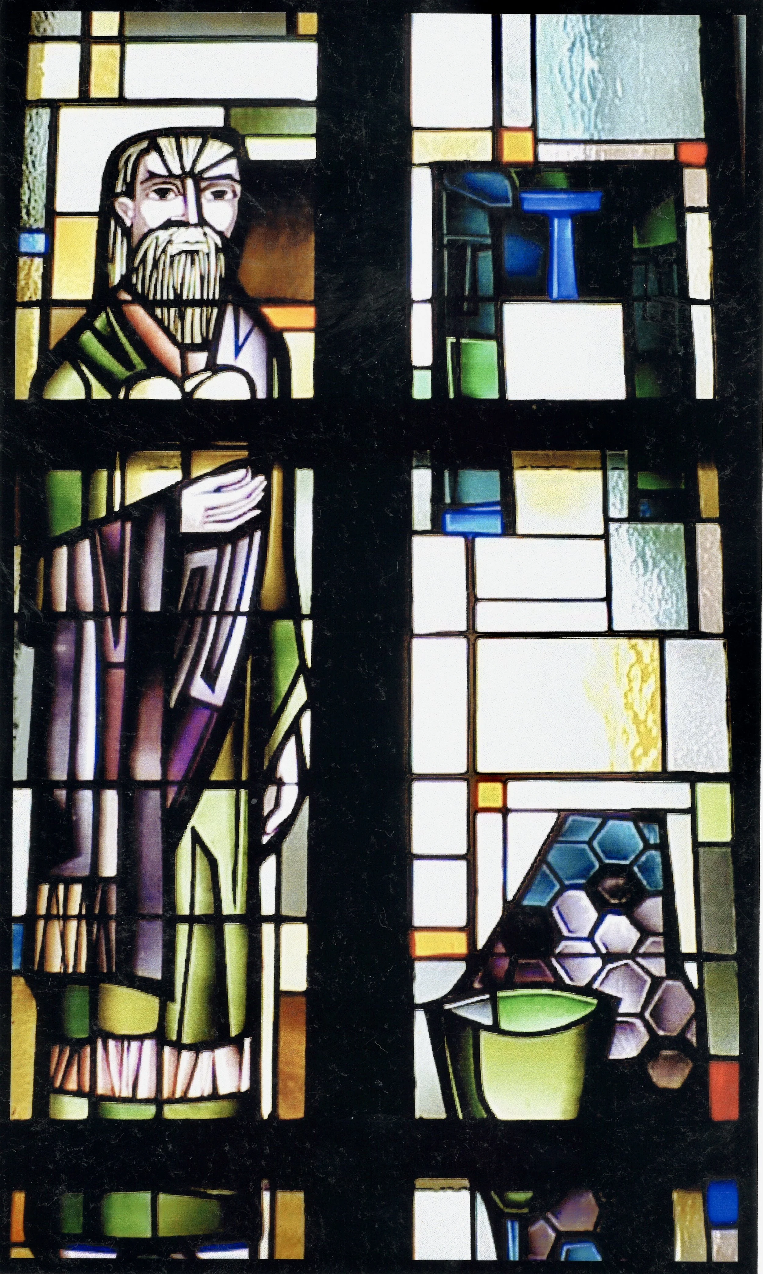 The symbol next to Noah’s head presents a bit of a mystery. The original pamphlet about the windows describes this with: “Rayed Equilateral Triangles represent God the Father and Creator.” There are two curiosities with this description: first, the phrase “rayed (equilateral) triangle” almost always refers to a common Freemason symbol. And second, equilateral triangles in Christian art typically represent the Trinity (three co-equal Persons)—not specifically “God the Father and Creator.” (See, for instance, the image of St. Athanasius holding an equilateral triangle). One possibility here, given the original placement of this symbol on a window with images from the opening chapters of Genesis, is that the equilateral triangle represents the trinitarian character of the creation event (that is, creation is attributed not to the Father alone, but to the preincarnate Word and the Spirit sweeping over the primordial waters as well), with the rays depicting something like the Big Bang/ “And there was light” moment.