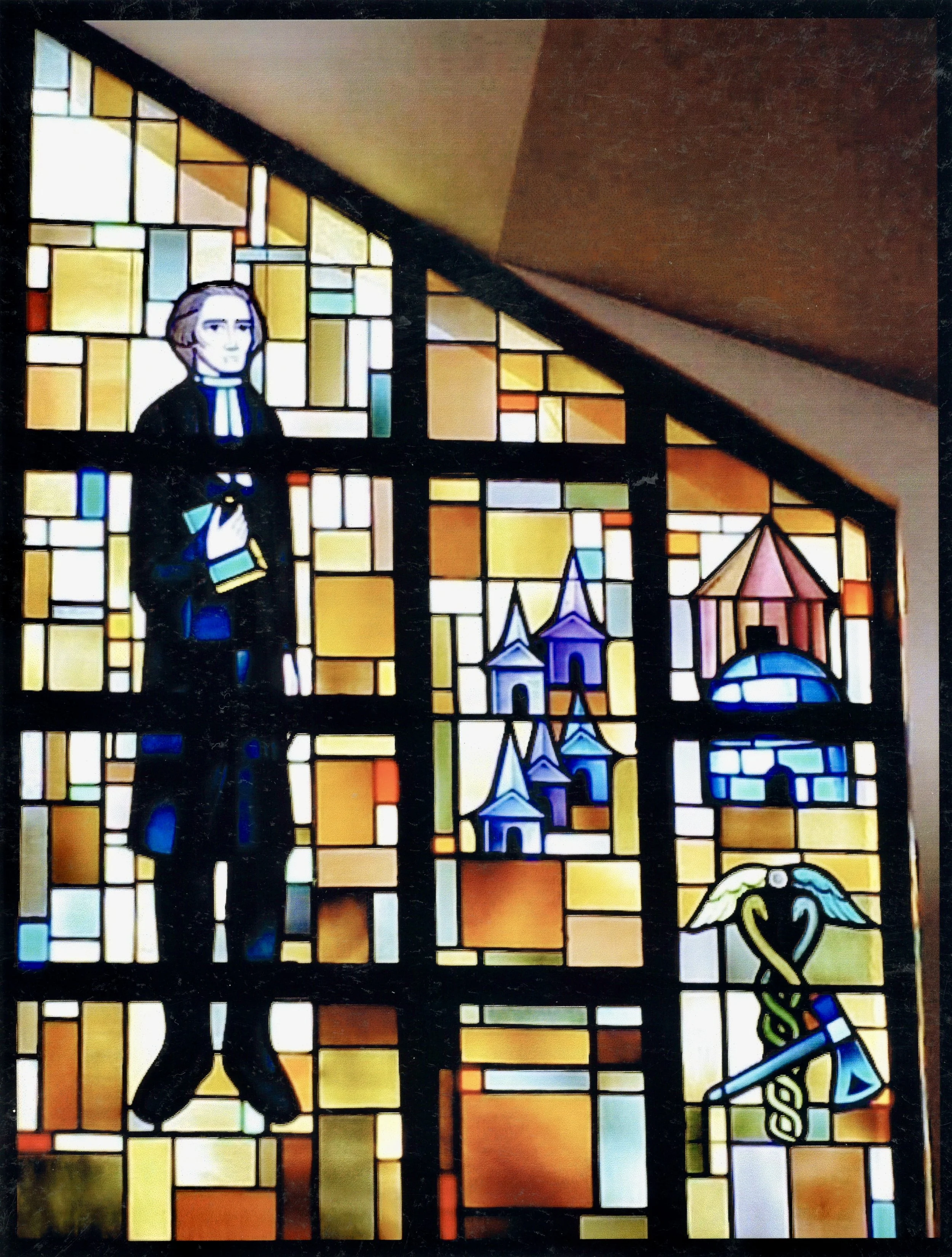The small church buildings represent the churches established by early Christian leaders in the New World. The image of igloo and hut represents missionary work. The igloo is a nod to Sheldon Jackson (1834-1909), a prominent Presbyterian missionary to Alaska (the igloo image was originally on a window depicting Jackson).